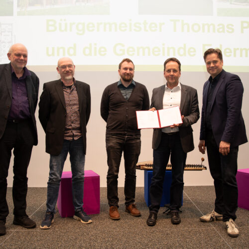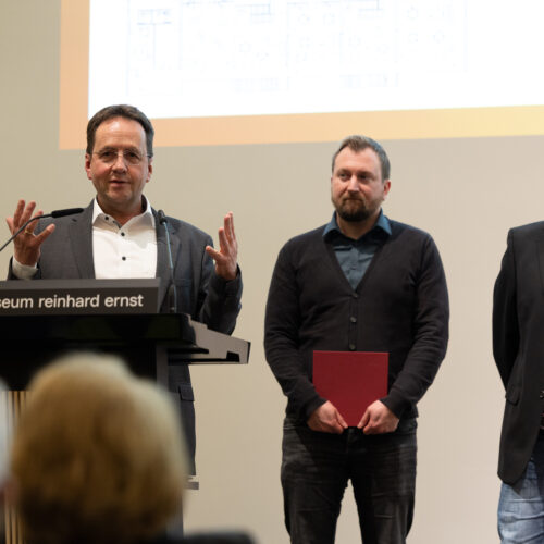 Nach der Begrüßung durch Moritz Kölling, Vorsitzender des BDA Hessen, wurde die erste Auszeichnung des Abends an die Reinhard & Sonja Ernst-Stiftung, Hausherrin des Veranstaltungsorts, vergeben. Der Wiesbadener Oberbürgermeister Gerd-Uwe Mende würdigte die beiden Stifter Reinhard und Sonja Ernst und überreichte die Urkunde gemeinsam mit Moritz Kölling an das Stifterpaar.