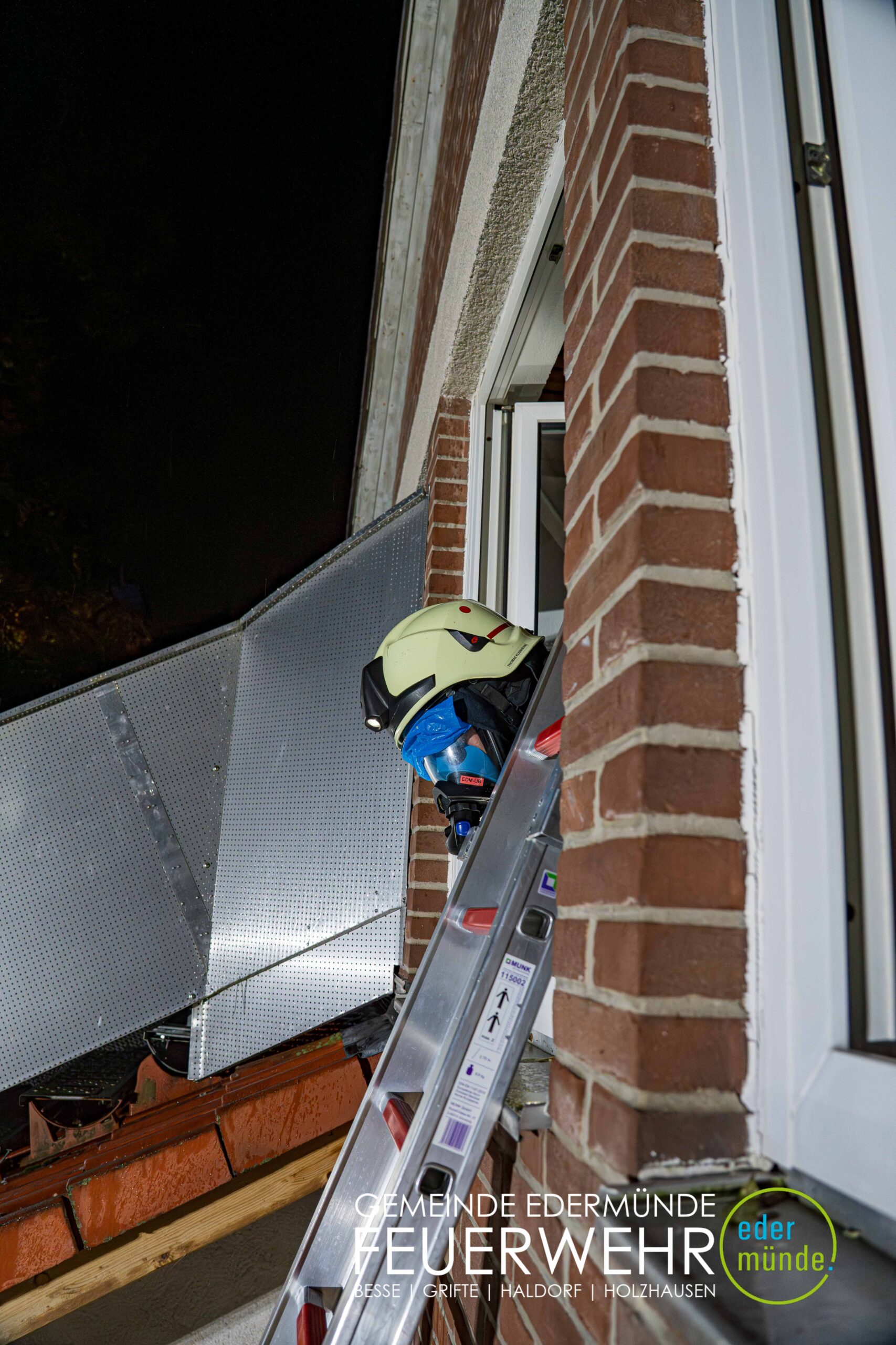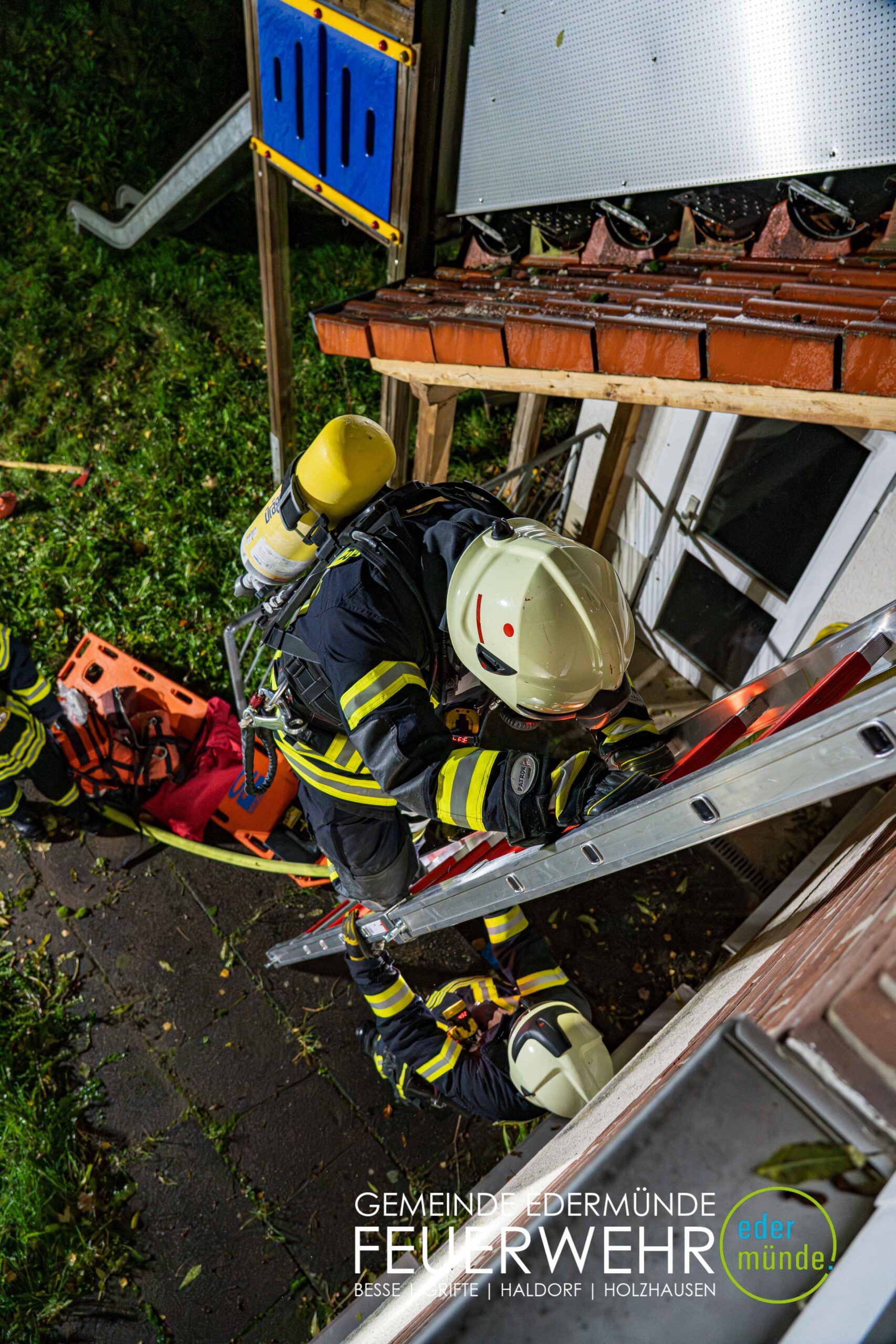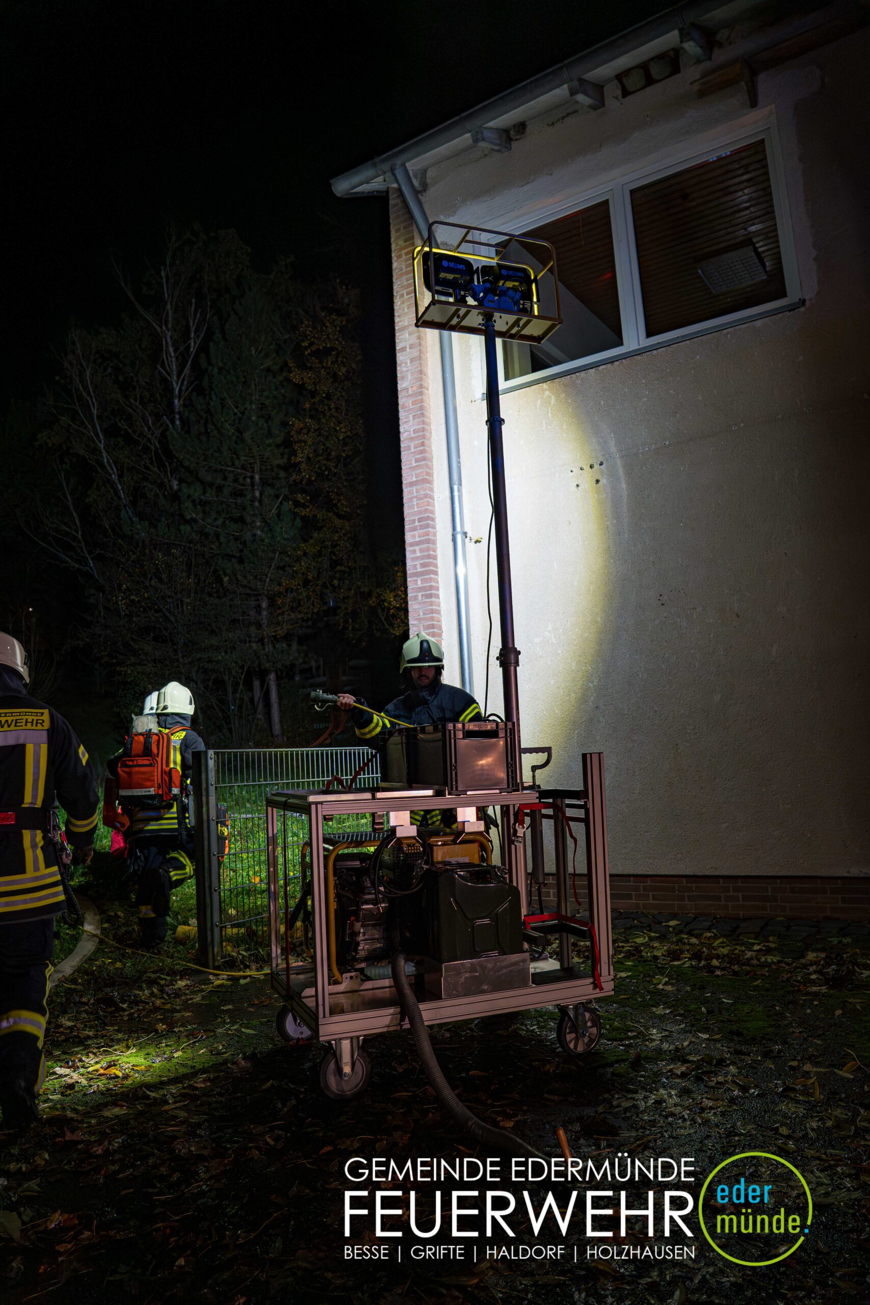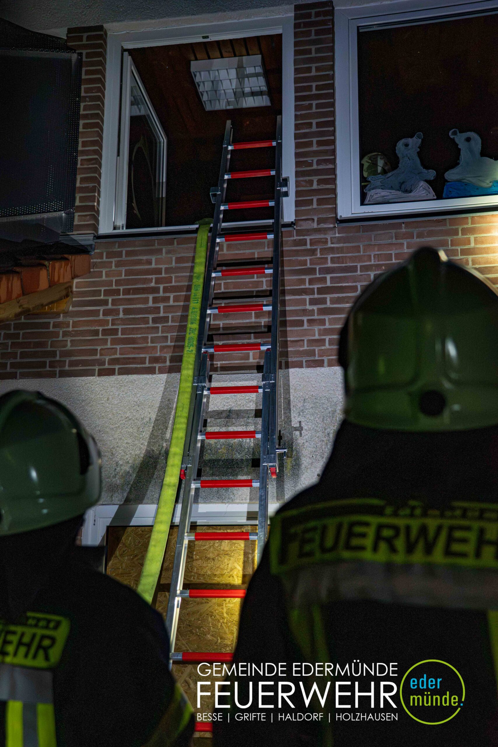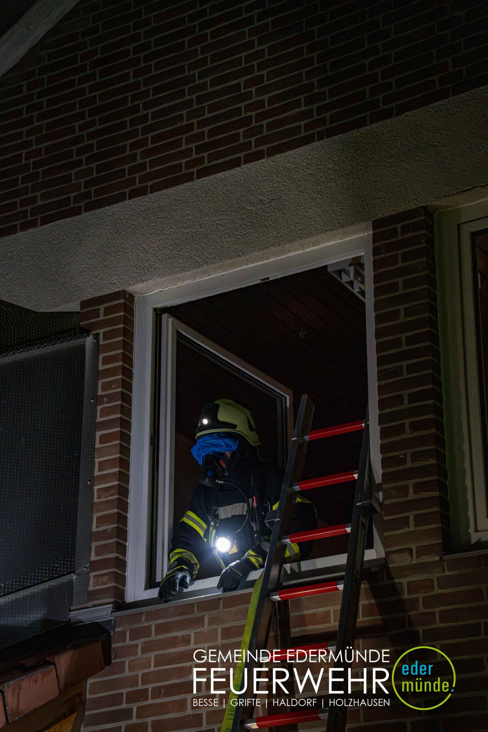 Schnell wurde sich ein erster Überblick verschafft und die Kräfte auf Vorder- und Rückseite des Gebäudes aufgeteilt. Während die Kräfte aus Guxhagen die Wasserversorgung aufbauten und einen ersten Trupp durch den Vordereingang schickten, brachten die Grifter Brandschützer Licht ins Dunkle und sorgten durch das Aufstellen einer Leiter für einen zweiten Angriffs- und Rettungsweg.