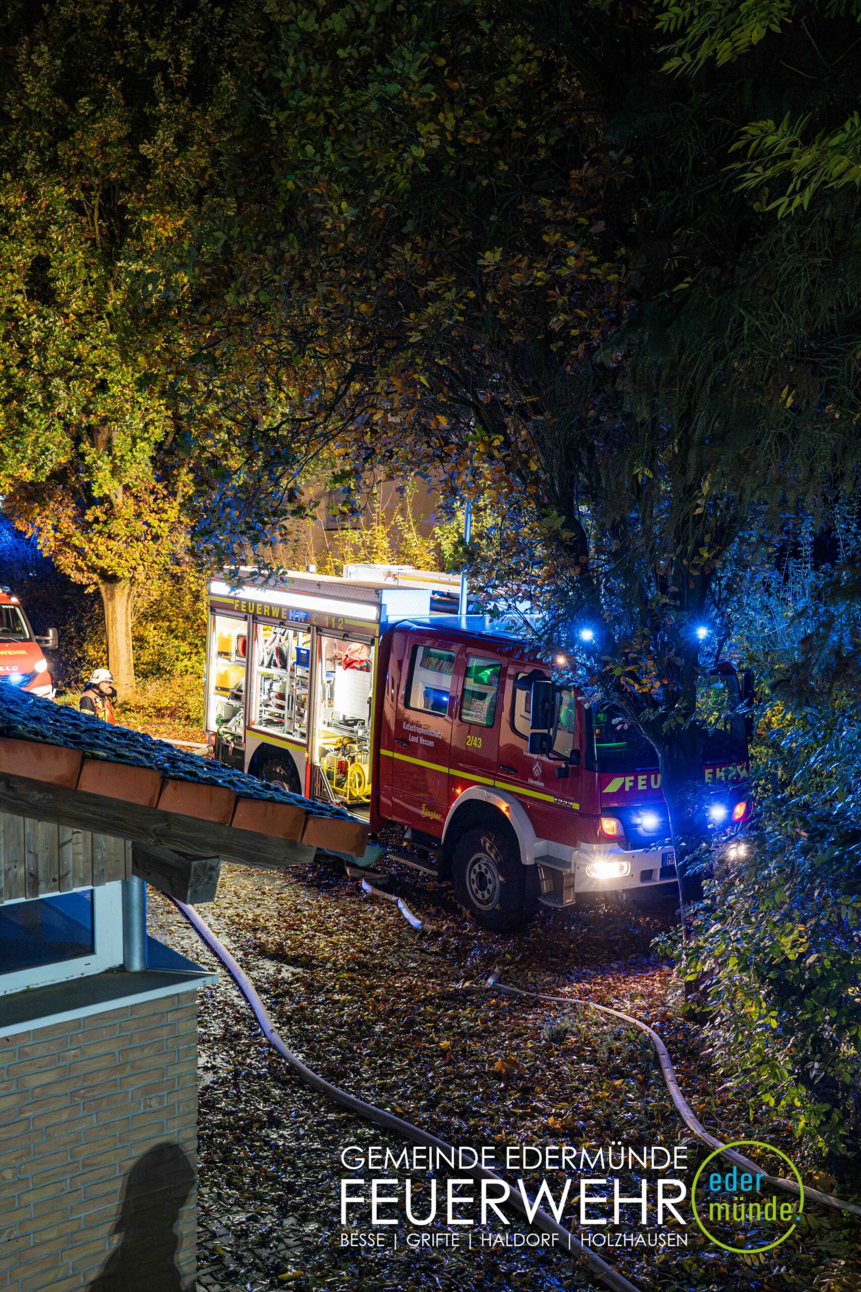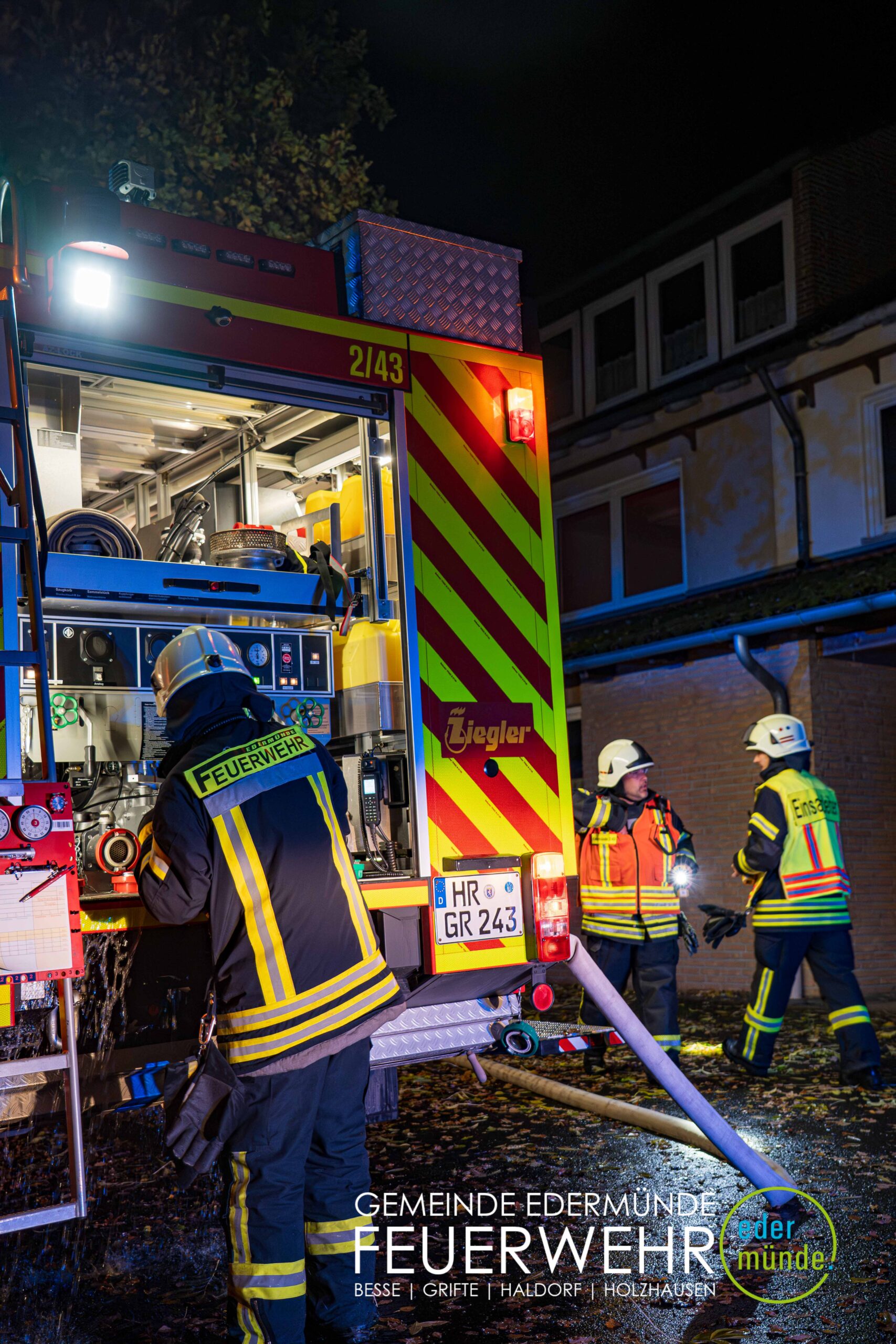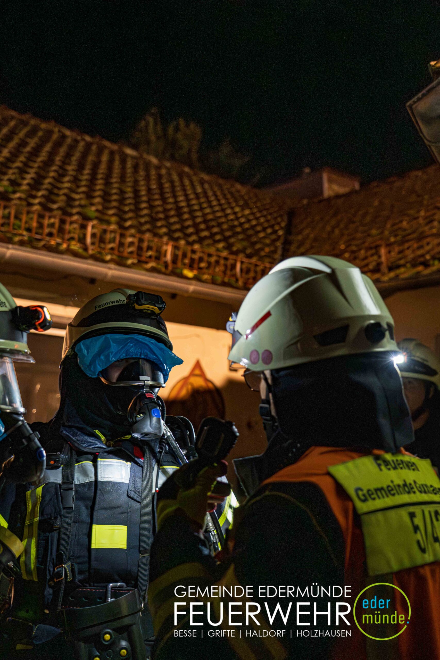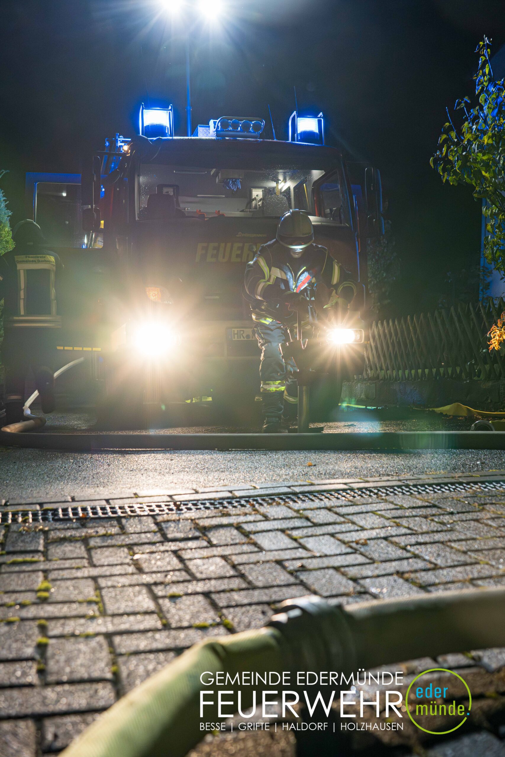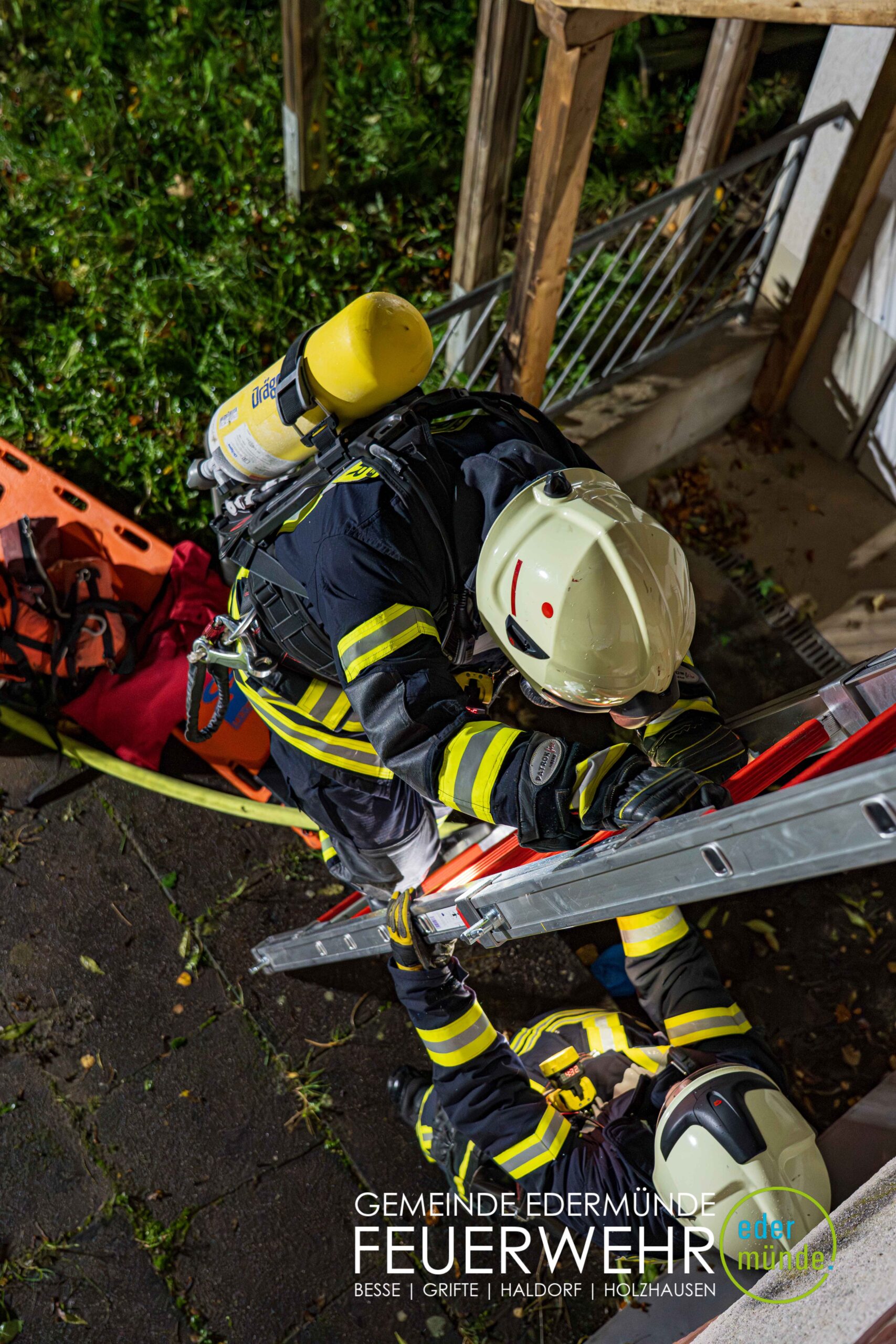 Schnell wurde sich ein erster Überblick verschafft und die Kräfte auf Vorder- und Rückseite des Gebäudes aufgeteilt. Während die Kräfte aus Guxhagen die Wasserversorgung aufbauten und einen ersten Trupp durch den Vordereingang schickten, brachten die Grifter Brandschützer Licht ins Dunkle und sorgten durch das Aufstellen einer Leiter für einen zweiten Angriffs- und Rettungsweg.