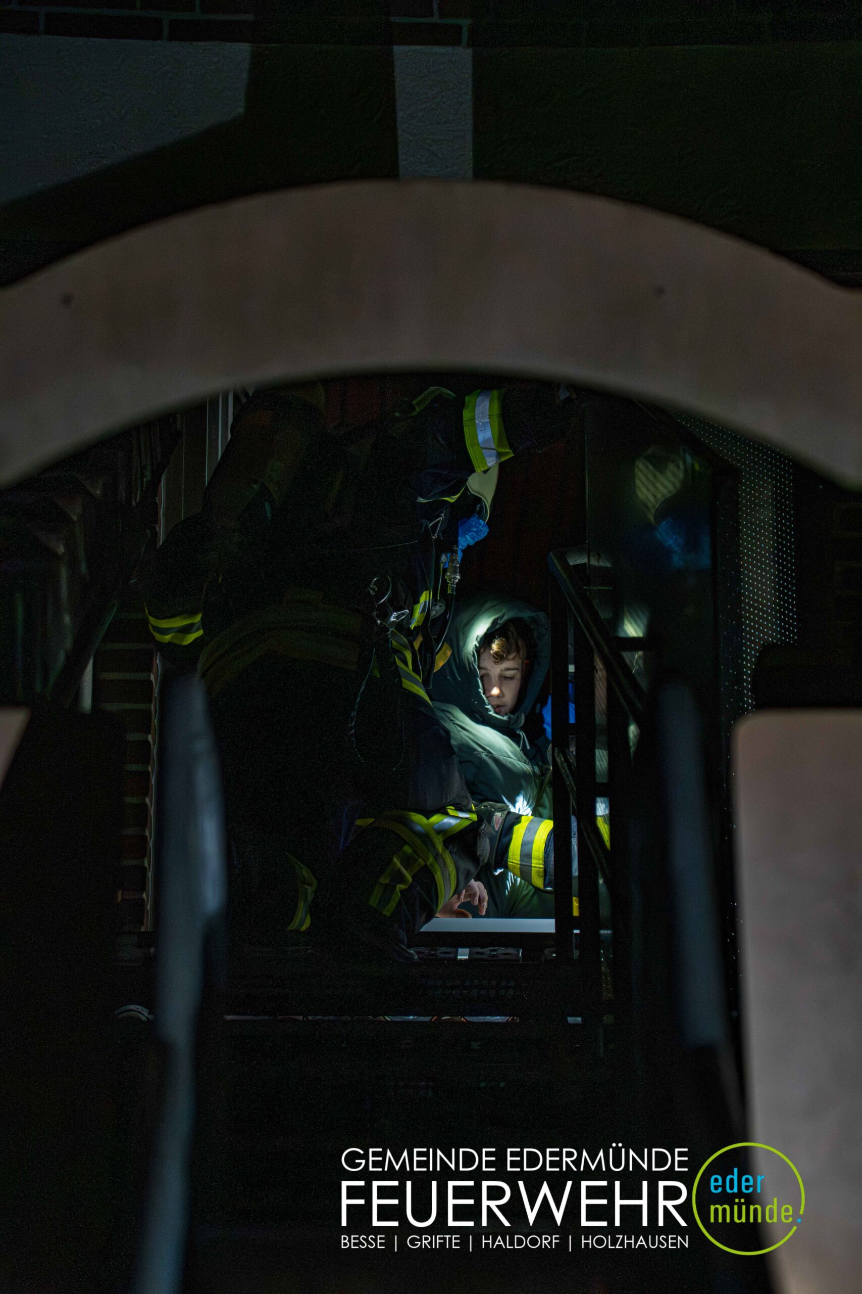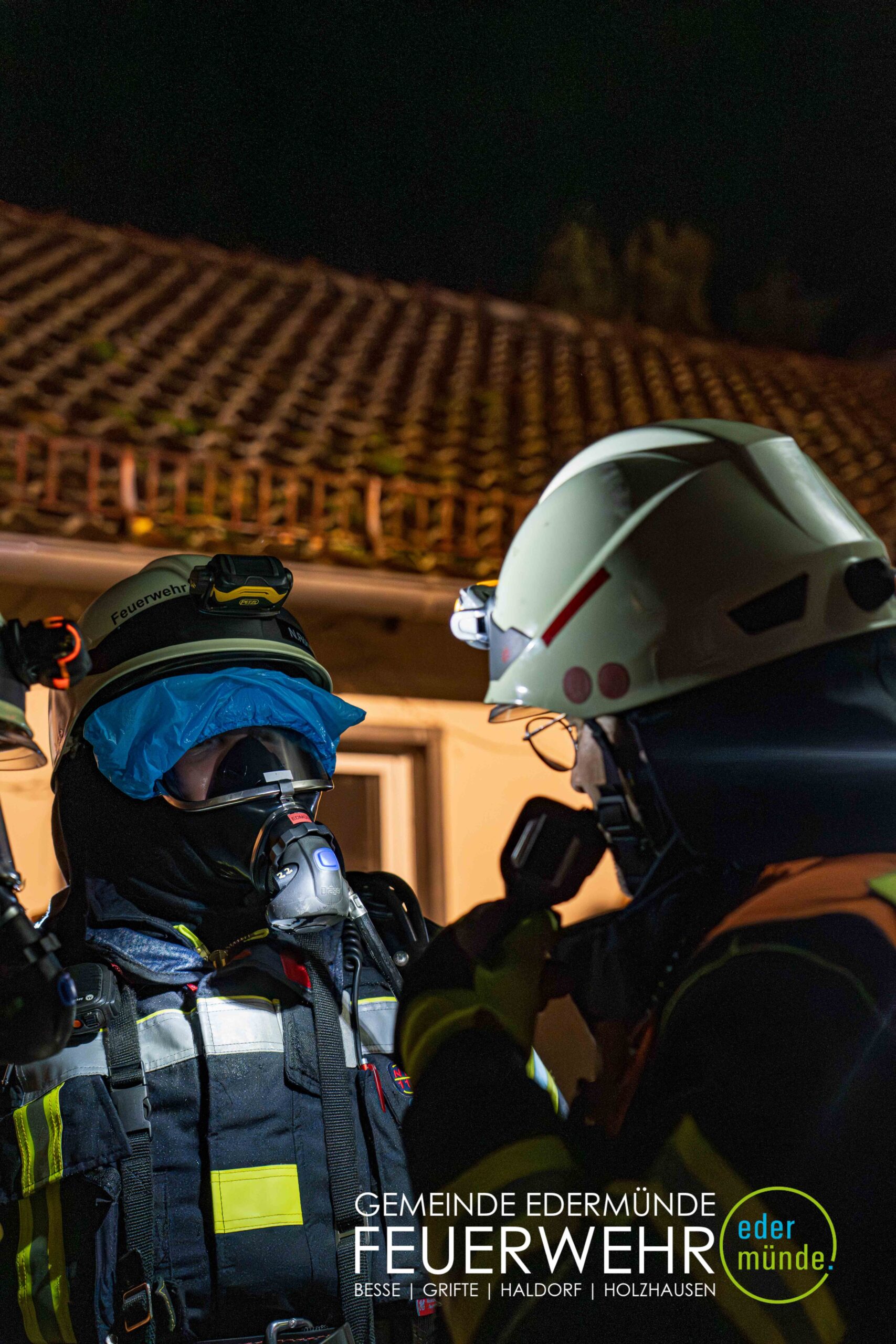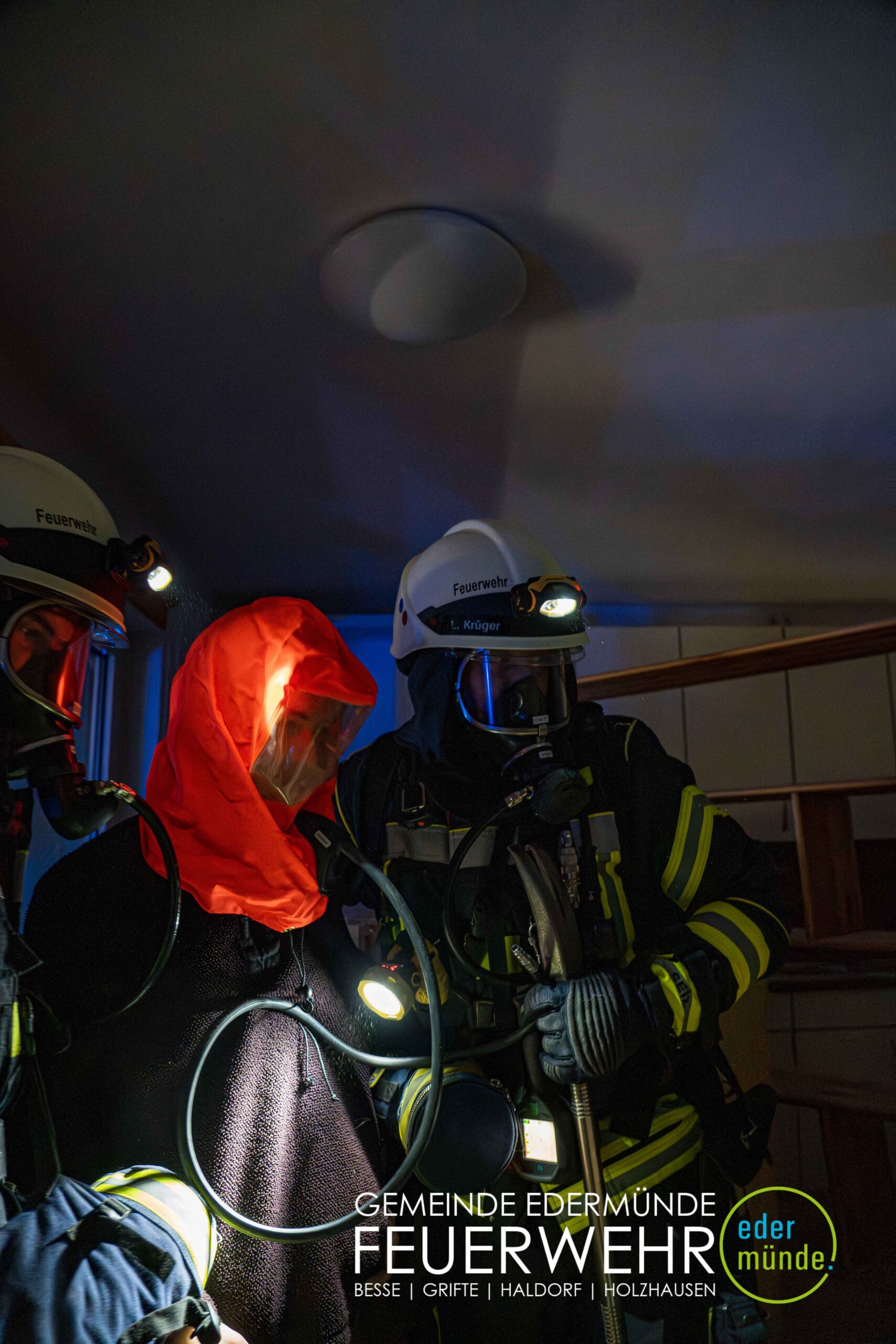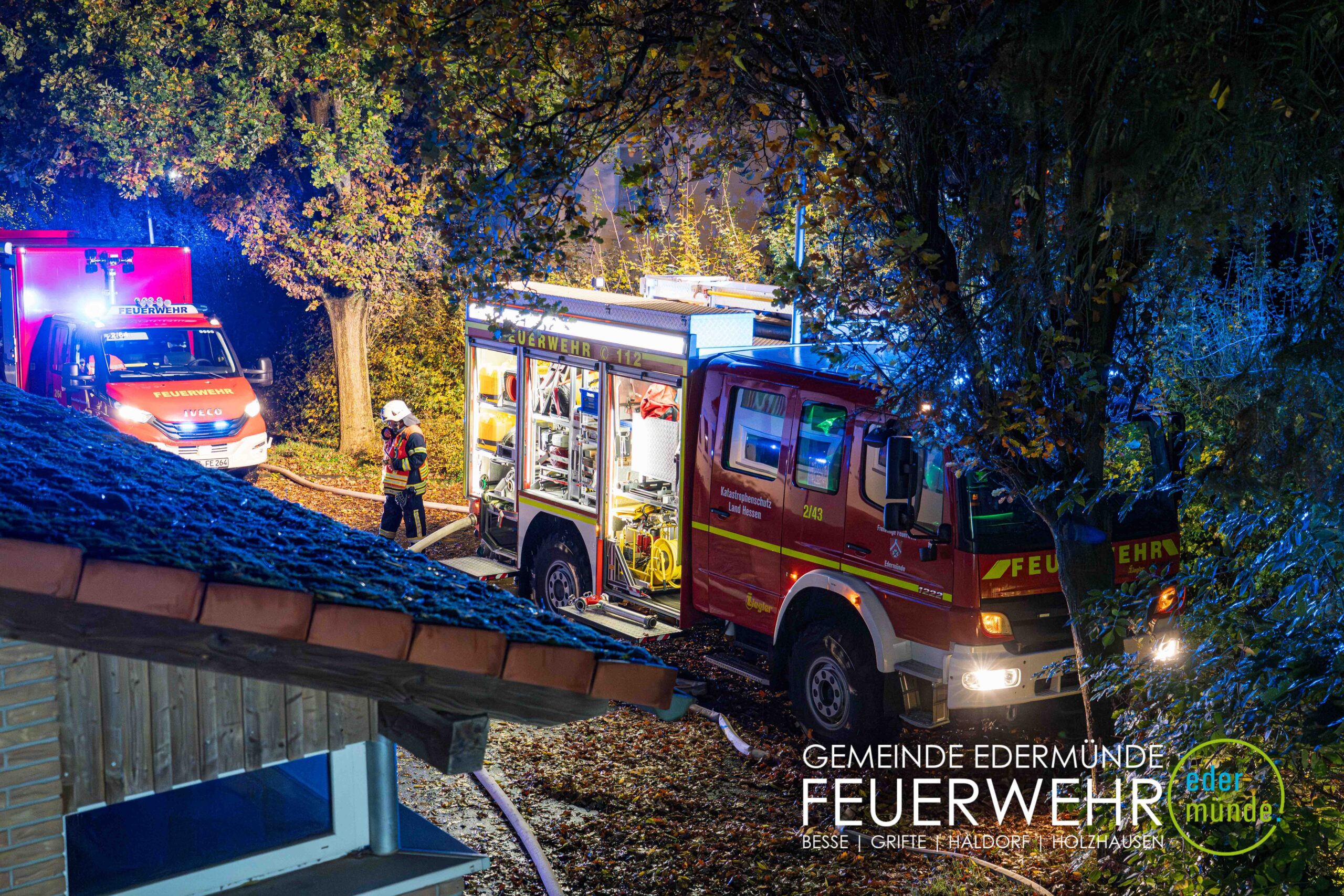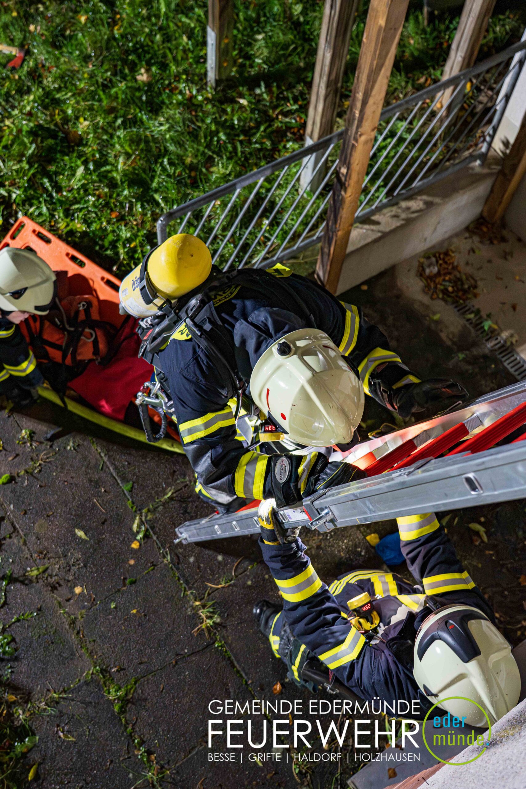 Schnell wurde sich ein erster Überblick verschafft und die Kräfte auf Vorder- und Rückseite des Gebäudes aufgeteilt. Während die Kräfte aus Guxhagen die Wasserversorgung aufbauten und einen ersten Trupp durch den Vordereingang schickten, brachten die Grifter Brandschützer Licht ins Dunkle und sorgten durch das Aufstellen einer Leiter für einen zweiten Angriffs- und Rettungsweg.