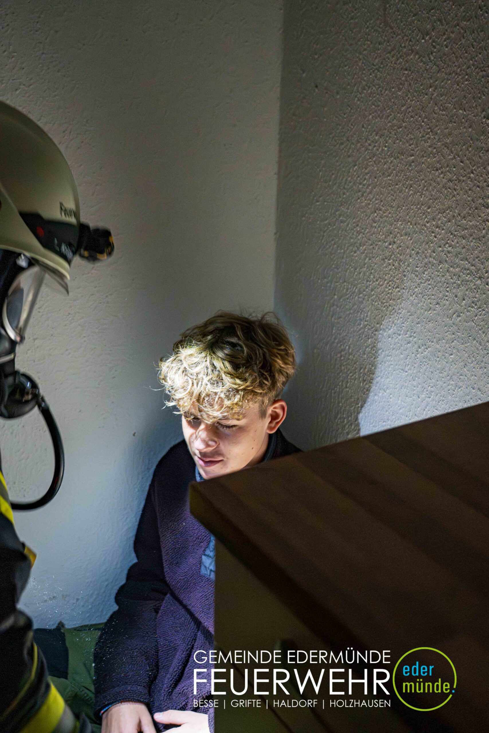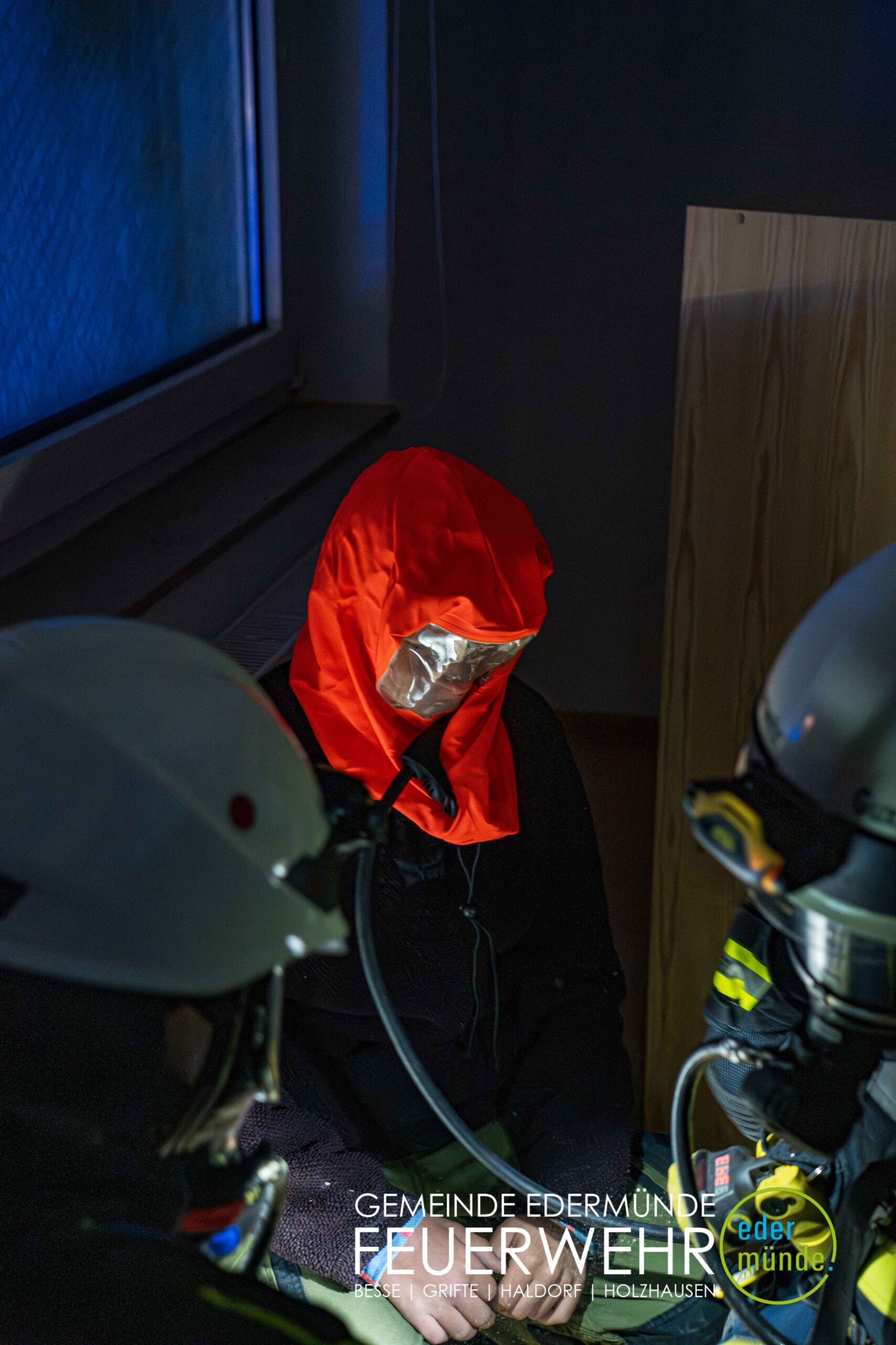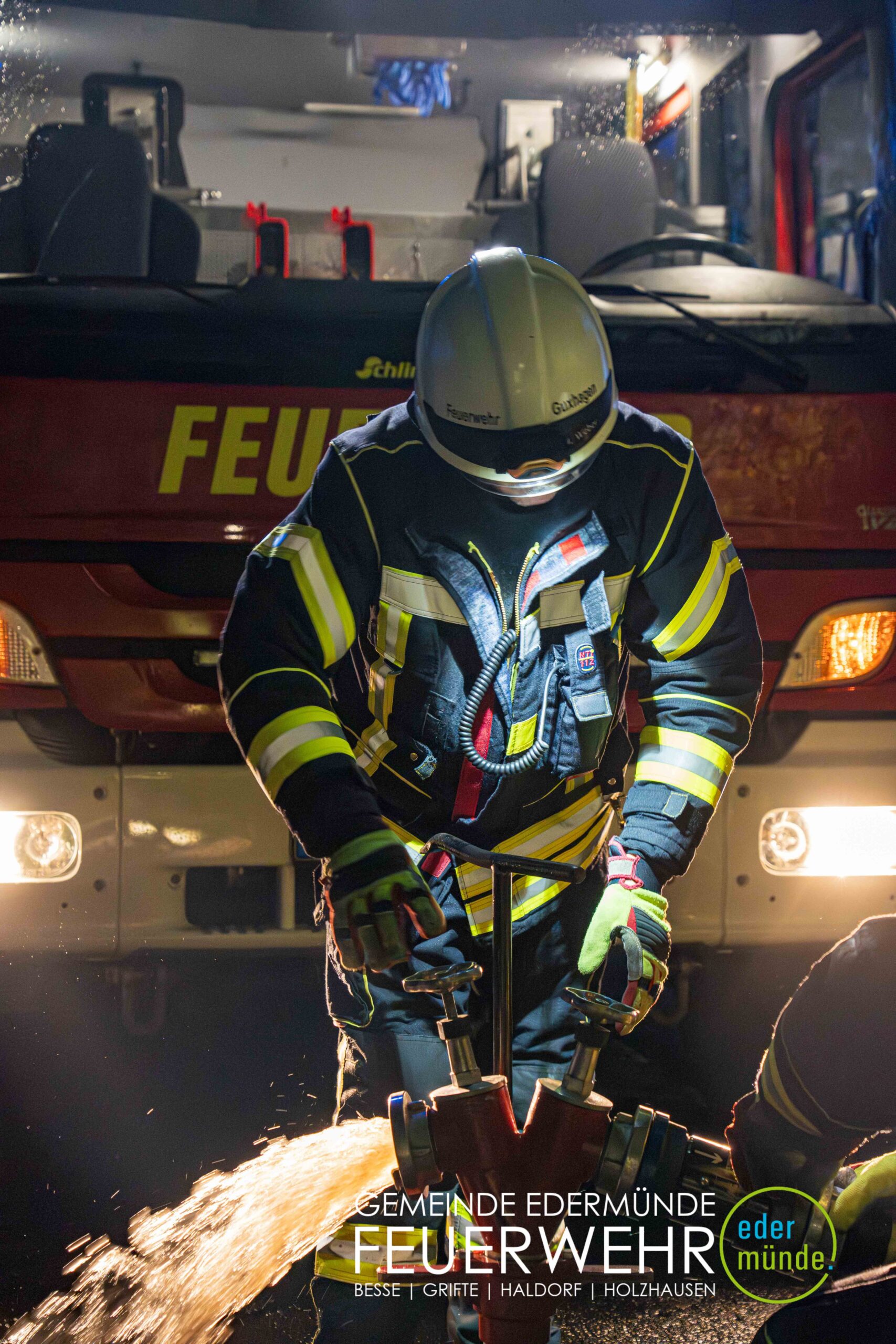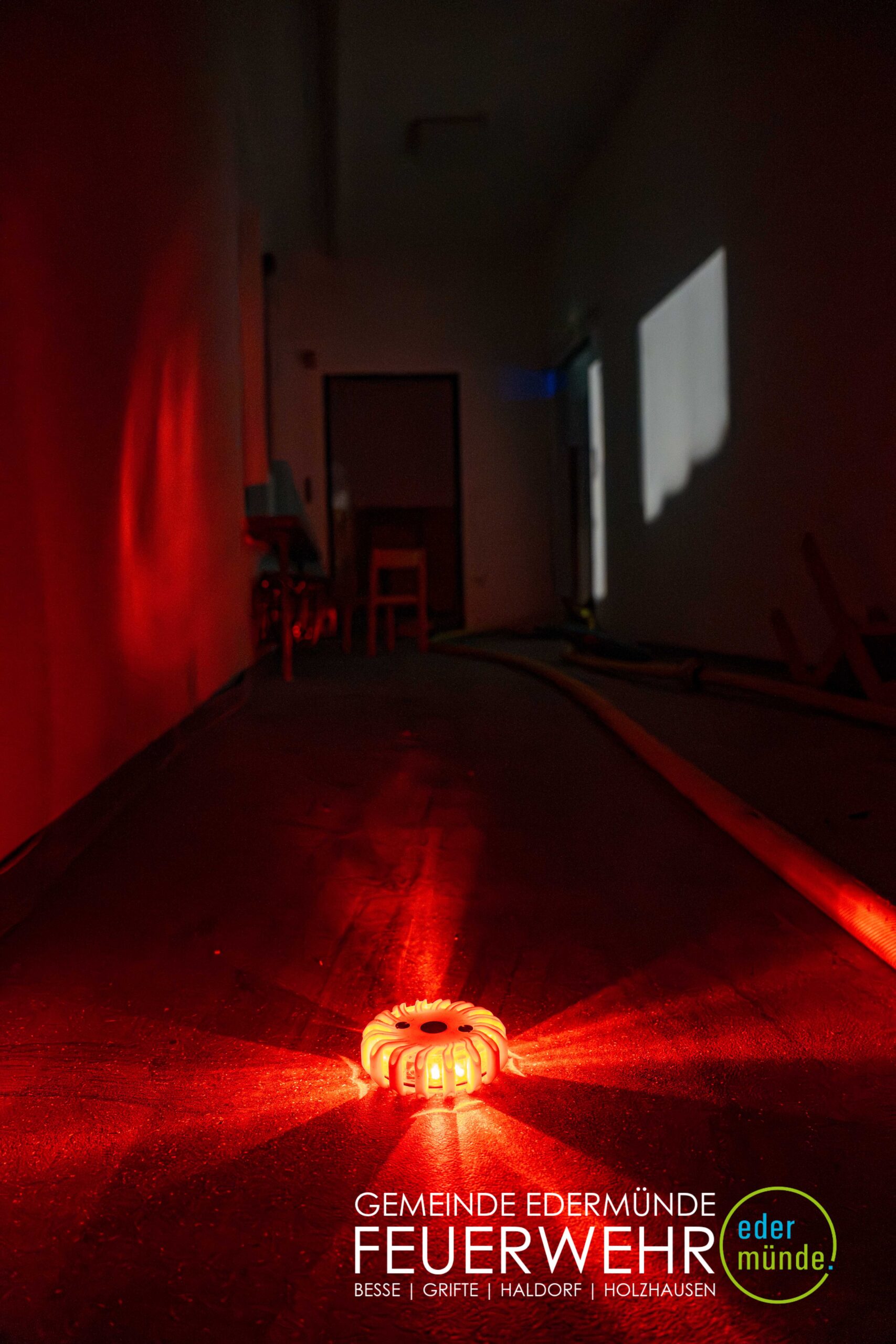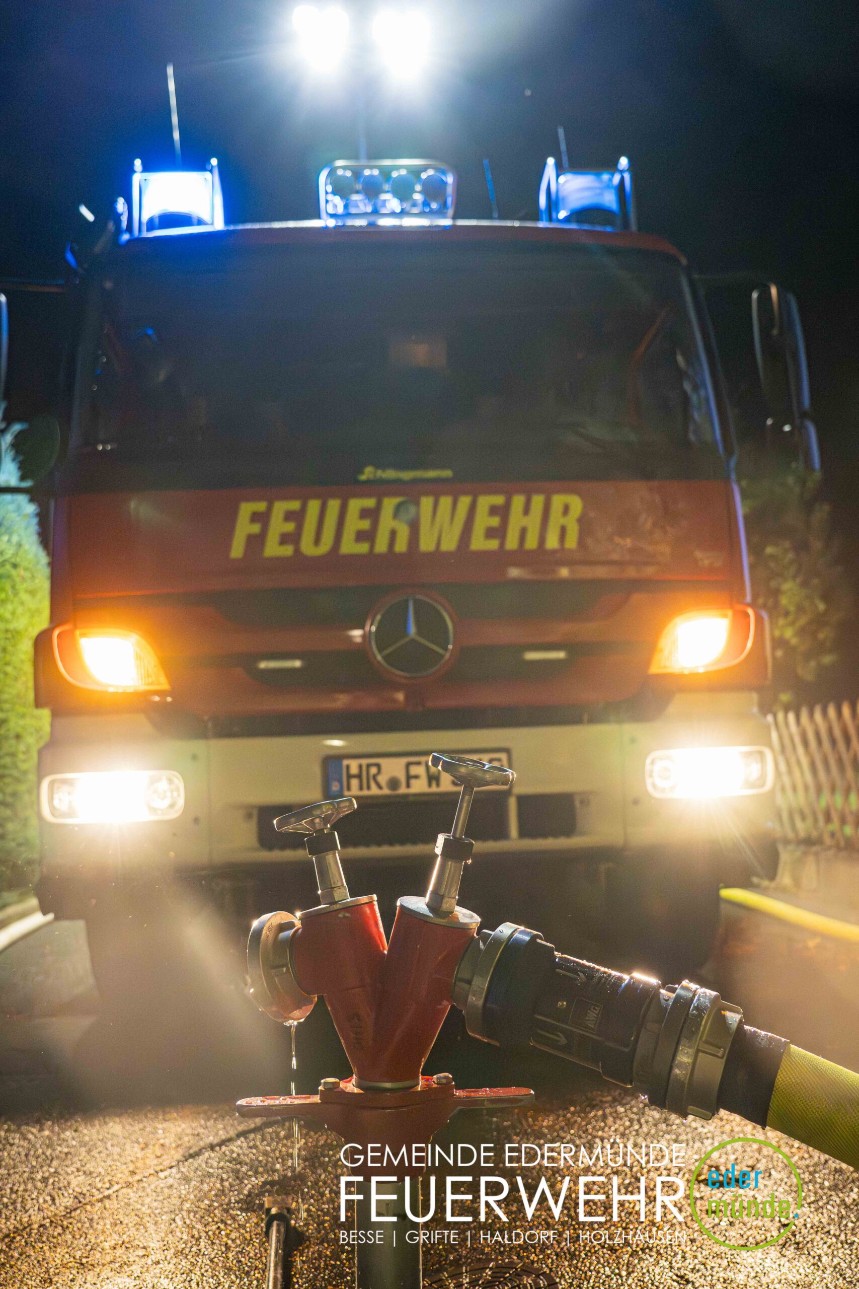 Schnell wurde sich ein erster Überblick verschafft und die Kräfte auf Vorder- und Rückseite des Gebäudes aufgeteilt. Während die Kräfte aus Guxhagen die Wasserversorgung aufbauten und einen ersten Trupp durch den Vordereingang schickten, brachten die Grifter Brandschützer Licht ins Dunkle und sorgten durch das Aufstellen einer Leiter für einen zweiten Angriffs- und Rettungsweg.