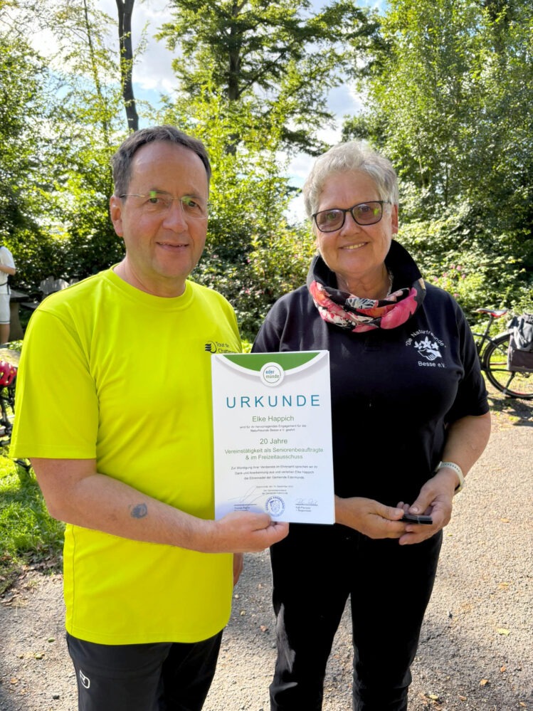 Am 14. September bei der Tour de Chattengau wurde nicht nur geradelt, sondern auch eine Ehrung bei den Naturfreunden Besse vorgenommen. Auf Vorschlag des Vereinsvorstands Volker Happich erhielt Elke Happich die Ehrennadel der Gemeinde Edermünde sowie eine Urkunde. Bereits seit 20 Jahren unterstützt sie die Naturfreunde im Freizeitausschuss und als Seniorenbeauftragte.