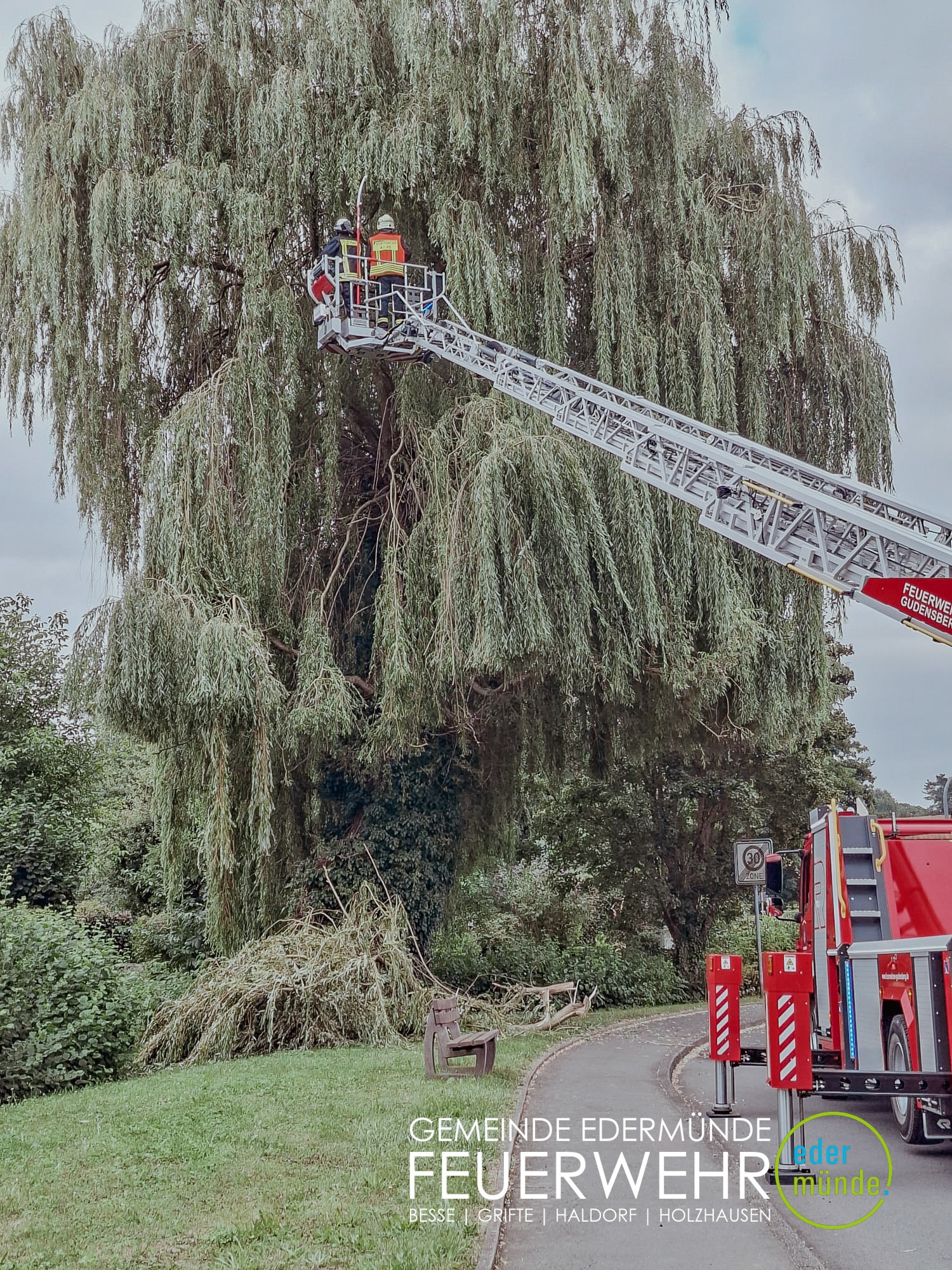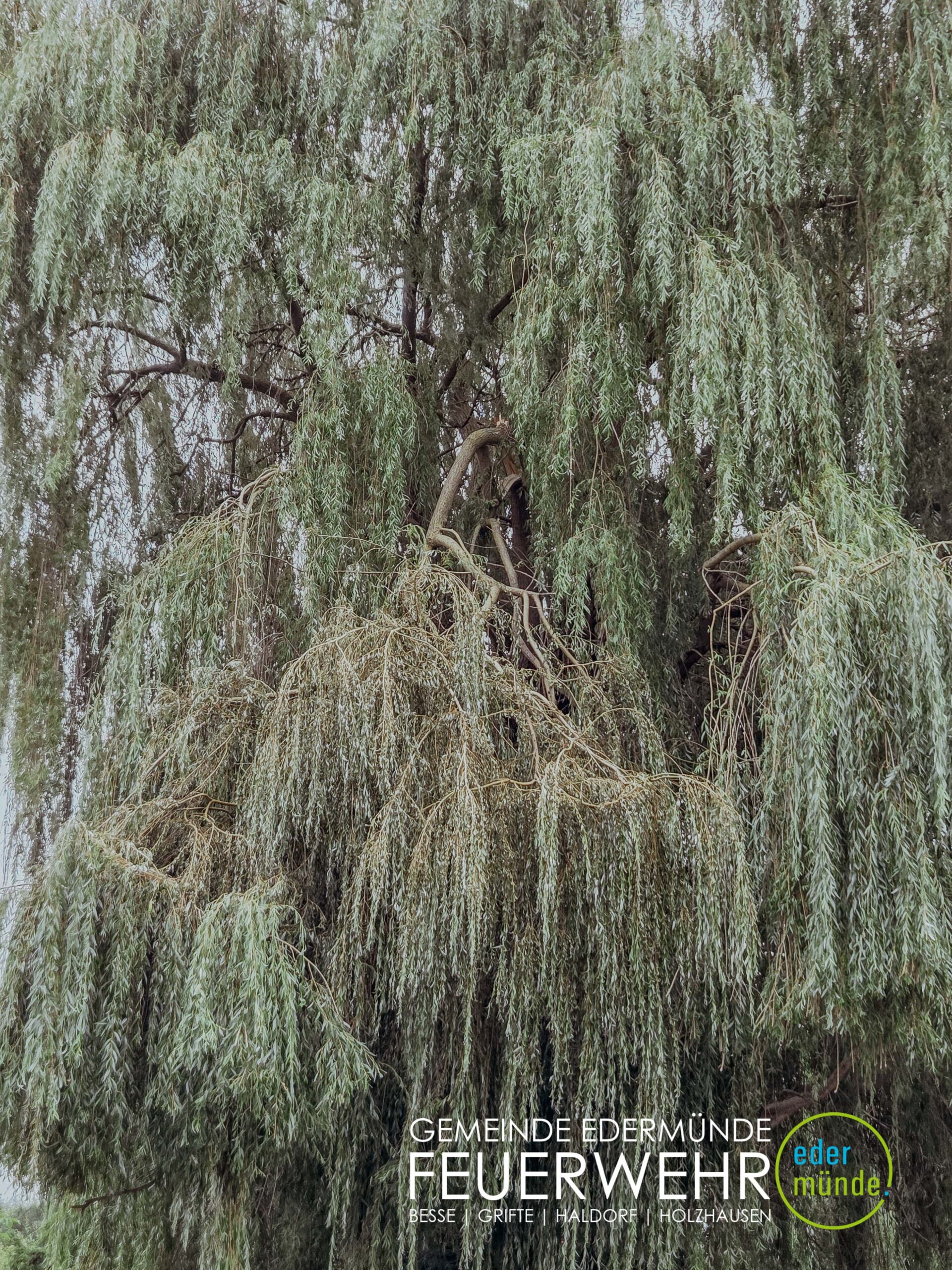 Da weitere Äste nicht gerade den besten Eindruck machten, wurde zusätzlich die Drehleiter der Feuerwehr Gudensberg alarmiert, um die Äste zu entfernen, bevor sie sich der Schwerkraft ergeben.