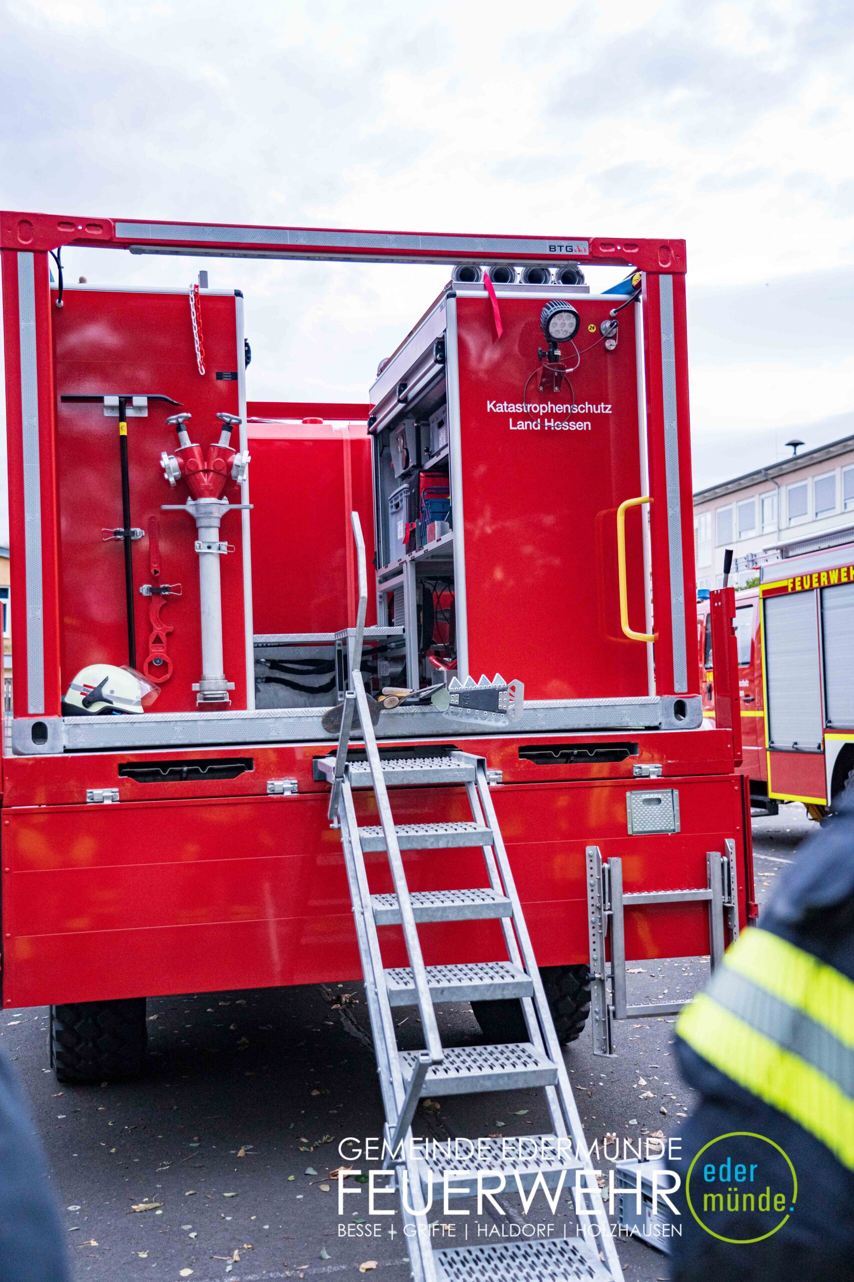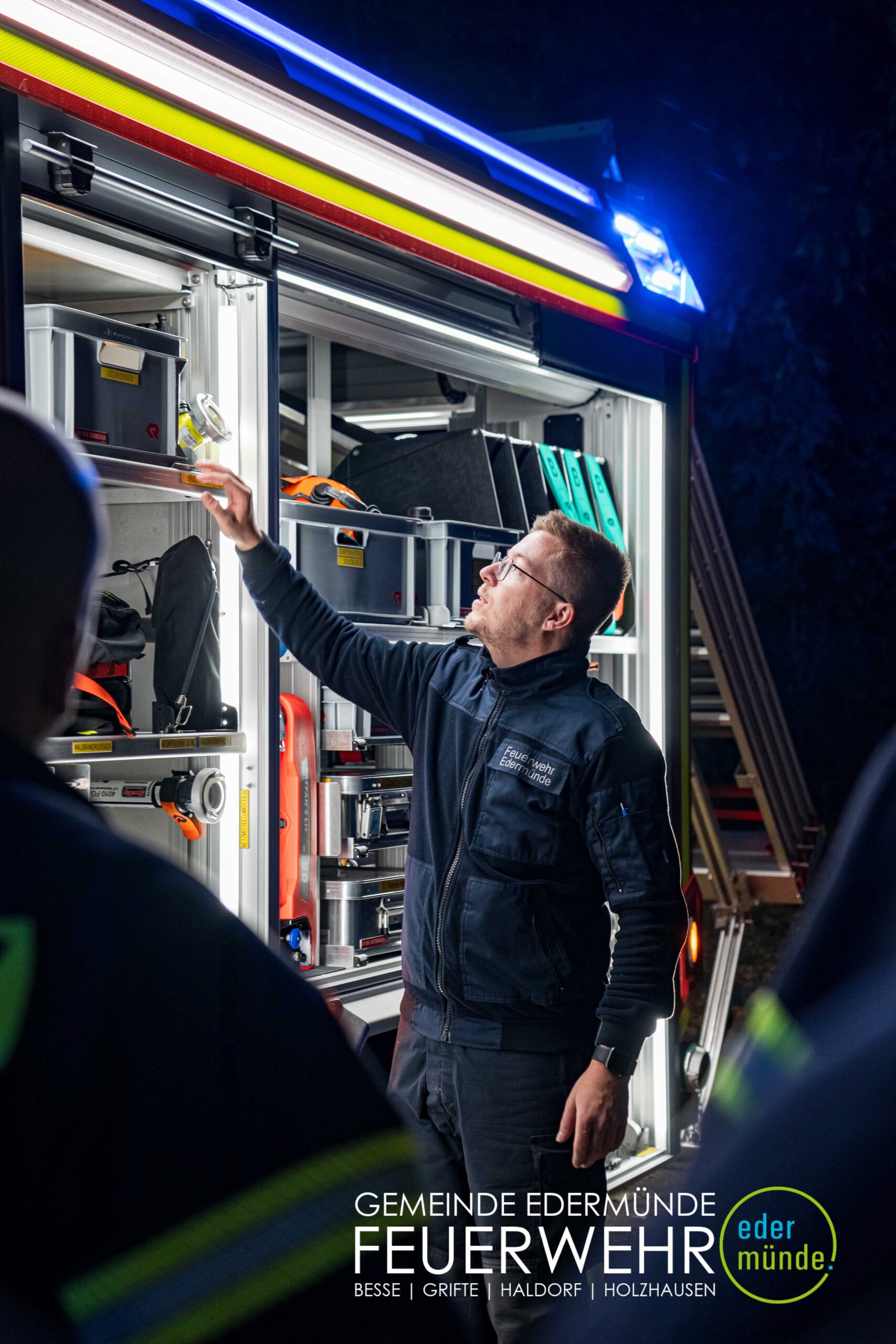 Die zwei weiteren Gruppen schauten sich zunächst das neue MLF aus dem Ortsteil Haldorf ganz genau an. Nachdem der Liefertermin immer wieder verschoben wurde, war die Vorfreude groß, dass wir das Fahrzeug endlich in Edermünde begrüßen durften.