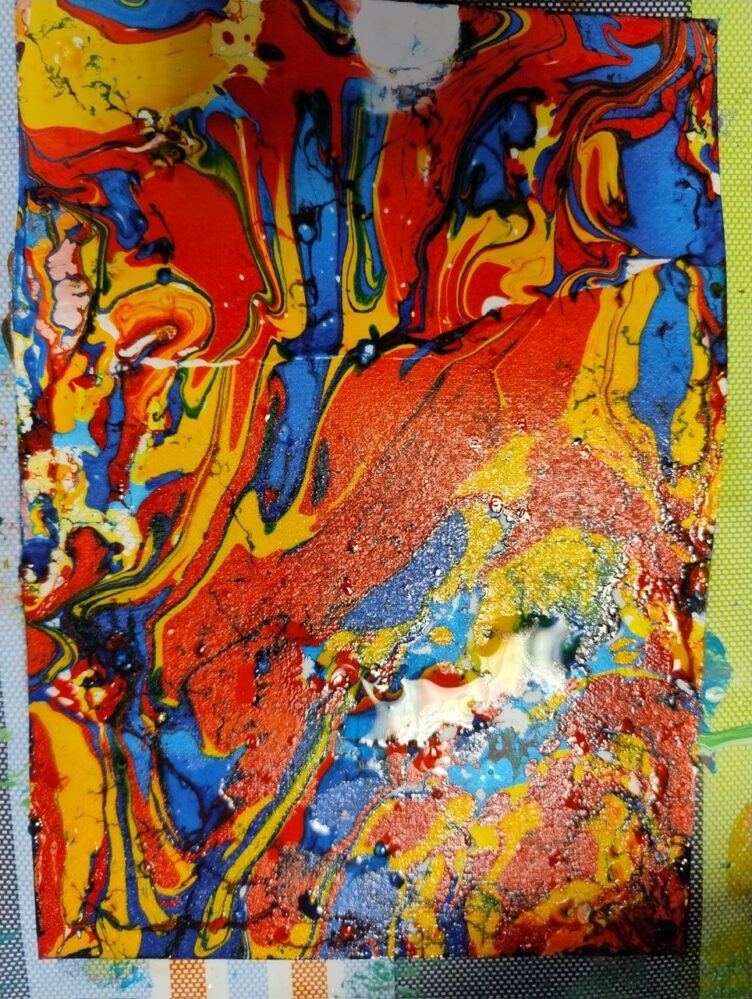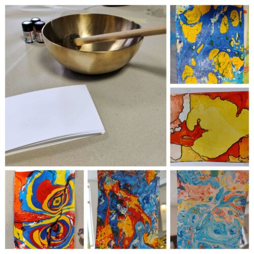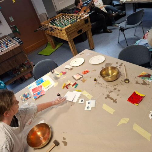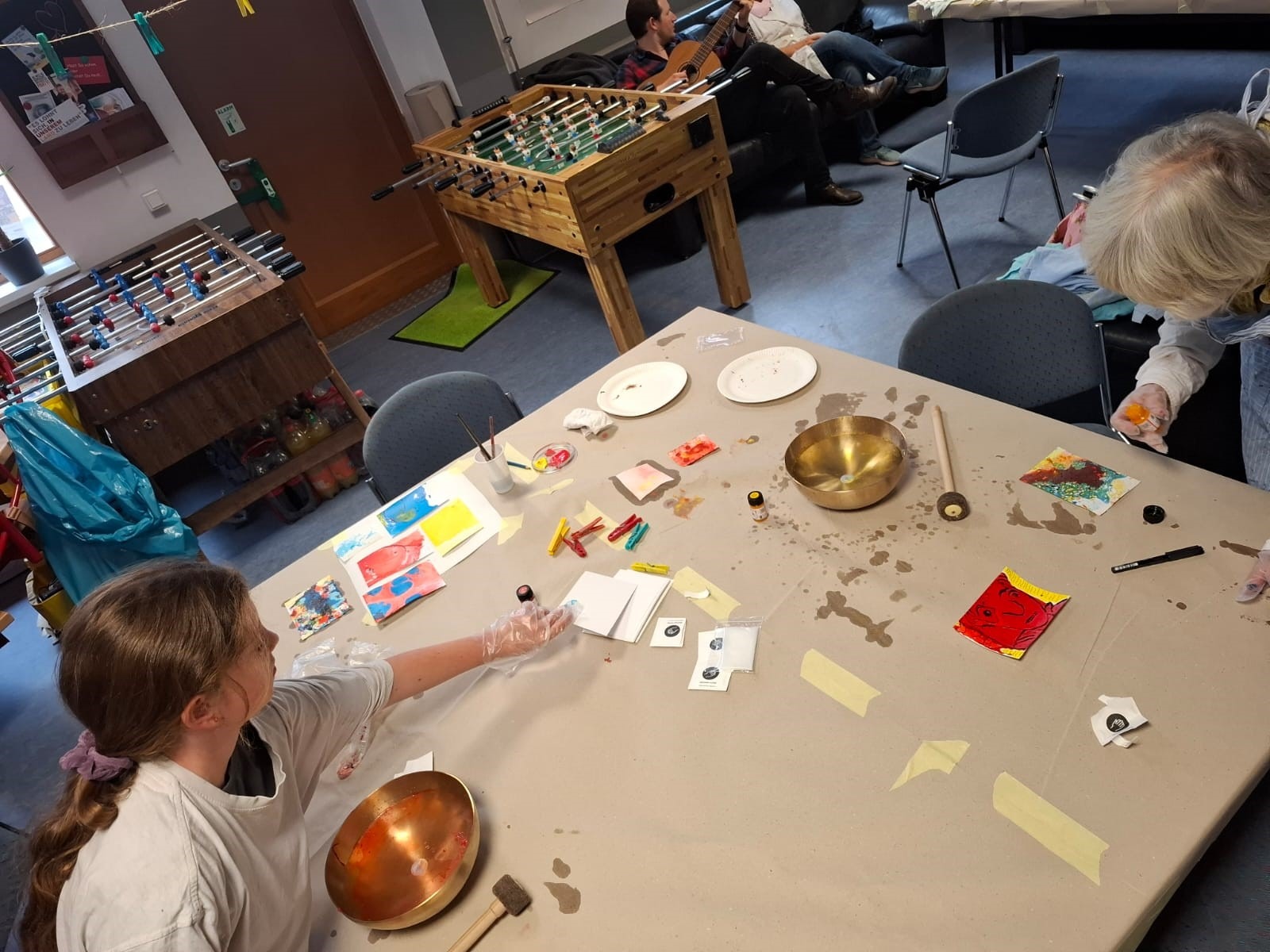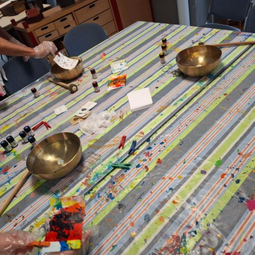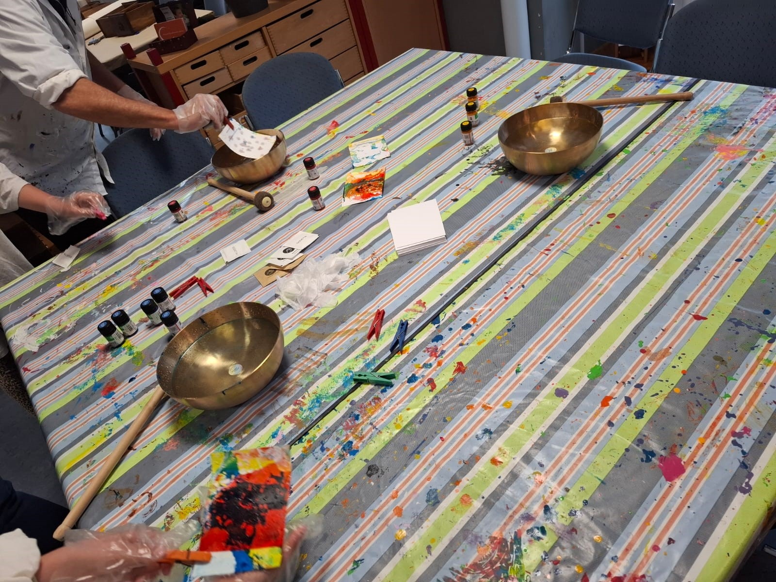 Diesmal gab es ein wirklich außergewöhnliches Angebot der „Mobilen Kunst a la carte“ mit Silke Domin und dem Musiker Felix Willing: "Magic Color" - Bilder entstanden beim Anschlagen der Klangschalen durch das Befüllen mit einer speziellen Lackfarbe.