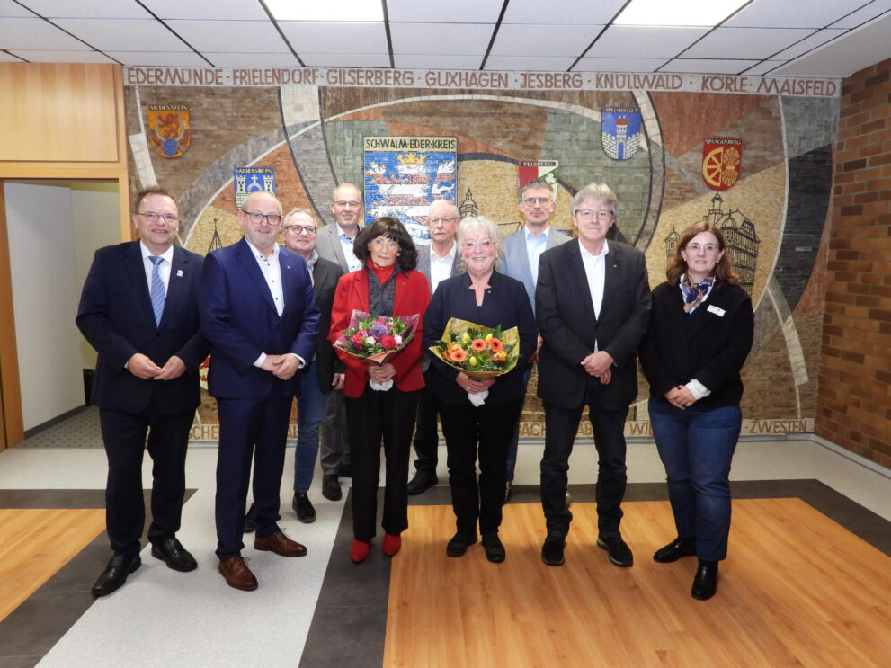 Bildunterschrift von links: Landrat Winfried Becker, Thomas Eichhorst – Geehrter, Armin Wicke – Vertreter der Gemeinde Eder-münde, Claus Steinmetz – Bürgermeister Wabern, Siglinde Flemming – Geehrte, Wulf Rudat – Stadtrat Fritzlar, Christel Östreich – Geehrte, Tobias Kreuter – Bürgermeister Schwalmstadt, Gerhard Rohm – Geehrter, Katharina Eisenach – Fachbereichsleiterin in der Kreisvewaltung