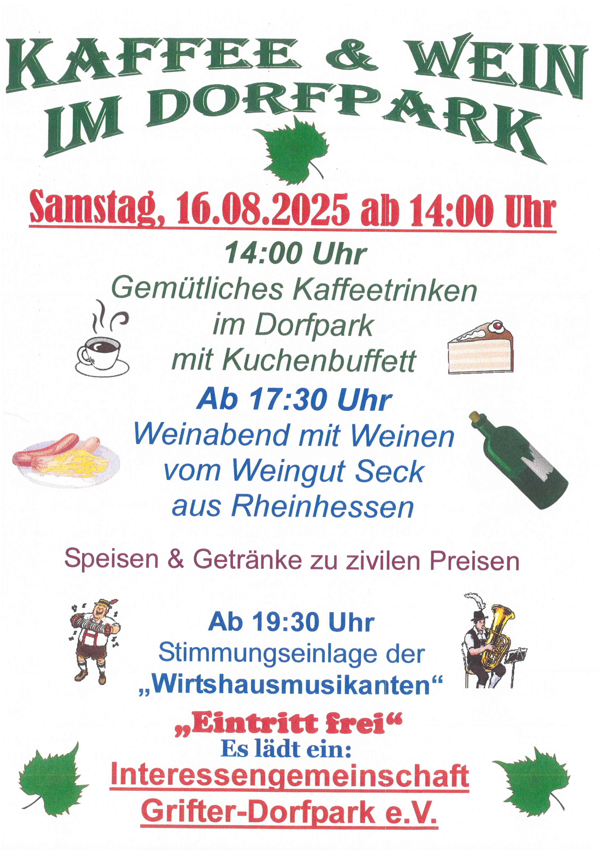 Die Interessengemeinschaft Grifter-Dorfpark e.V. lädt zum Kaffee & Wein im Dorfpark Grifte ein.